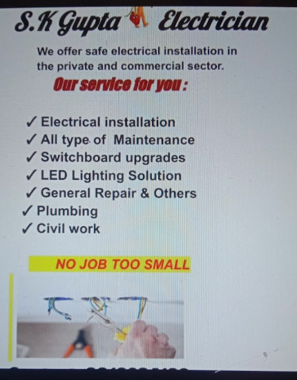 S.K. Gupta Electrician in Navi Mumbai offers professional and reliable electrical services. With a team of skilled electricians, they provide 24/7 service for everything from repairs to installations. Known for their prompt response and quality workmanship, S.K. Gupta Electrician ensures customer satisfaction with every project. Trust them for all your electrical needs in Navi Mumbai.